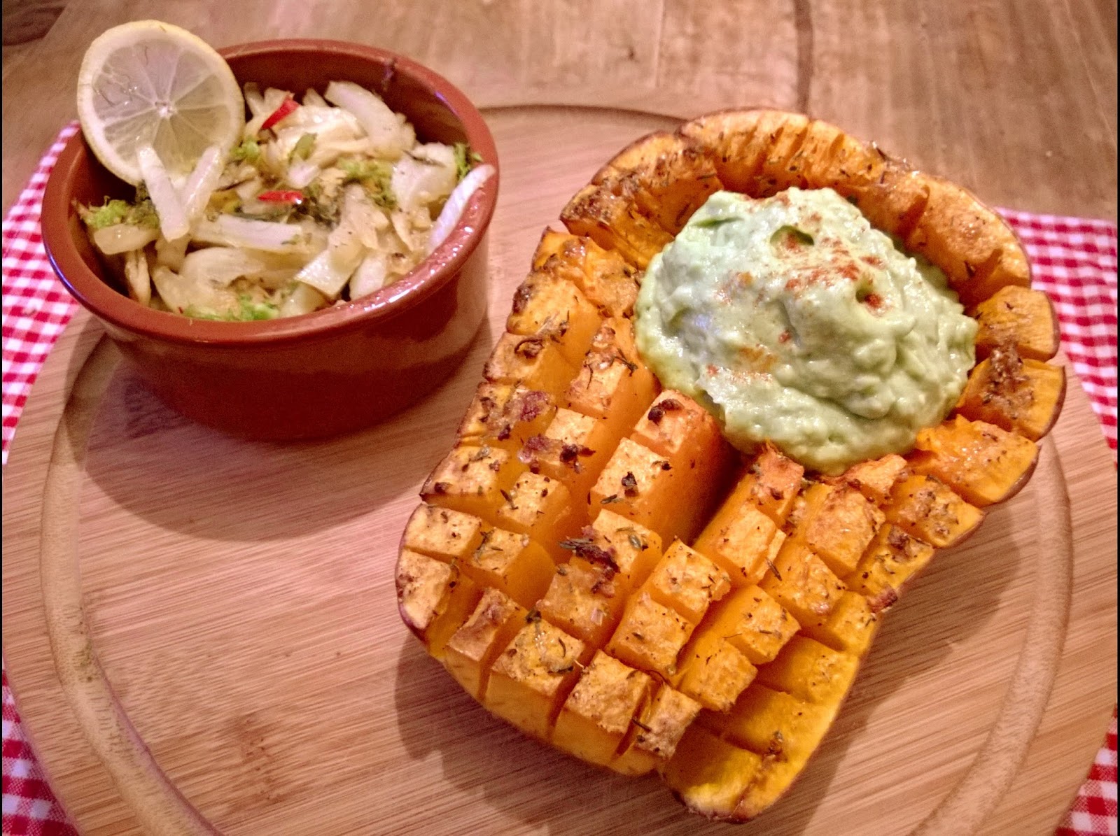 Vegan O Mania Gebackener Butternut Kurbis Mit Avocadodip Und Zitronen Fenchel