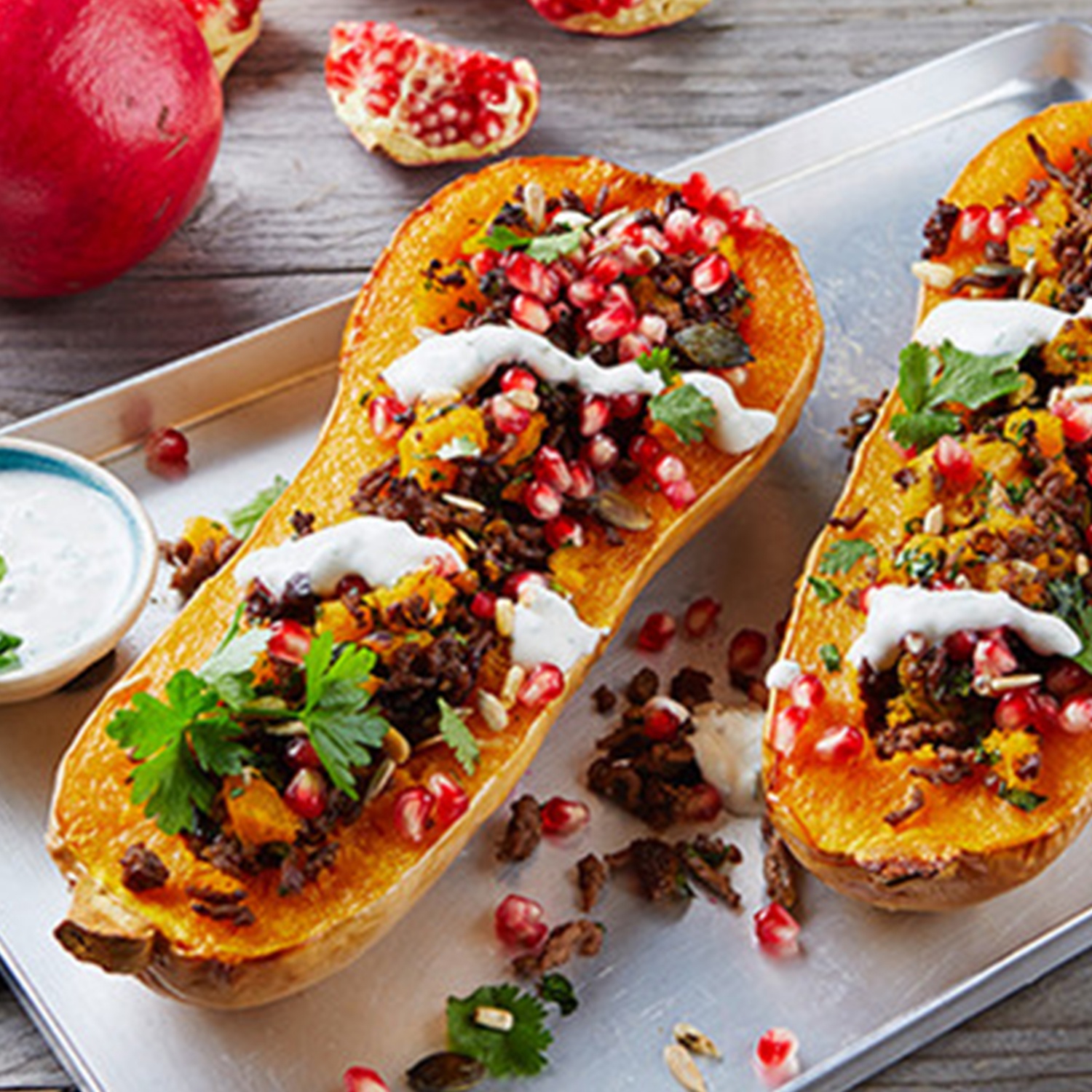 Butternut kürbis gefüllt mit hackfleisch.