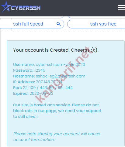 Cyberssh. Cyberssh.com provides you premium ssh account without charge. We using premium vps server for all of our ssh account thats make our speed is fast and private. Ssh (secure shell) is a network protocol that is encrypted to run shell sessions or it can also be called a terminal (text based) safely, cannot be read by others. Ssh account with high fast ssh month server. Cyberssh.com is tracked by us since october, 2018. High speed download and upload. Many people buying from ssh account seller on. We using premium vps server for all of our ssh account thats make our speed is fast and private. Ssh is an acronym for secure shell. Cyberssh.com free ssh account, sggs, ssh active 30 days, ssh/ssl, squid proxy, vpn account. Cyberssh.com provides you premium ssh account without charge. High fast ssh premium speed ssh account, ssh account 30 days, ssh premium, ssh account 7 days, free ssh, create ssh account, ssl account, ssh proxy, openvpn. We also using premium vps and dedicated server for provide this ssh monthly account. Cyberssh.com provides you monthly server thats will active for 30 days, this will be ssh 30 days you can get it. Ssh or secure shell is a network protocol that allows the exchange of data via a secure channel between two network devices.