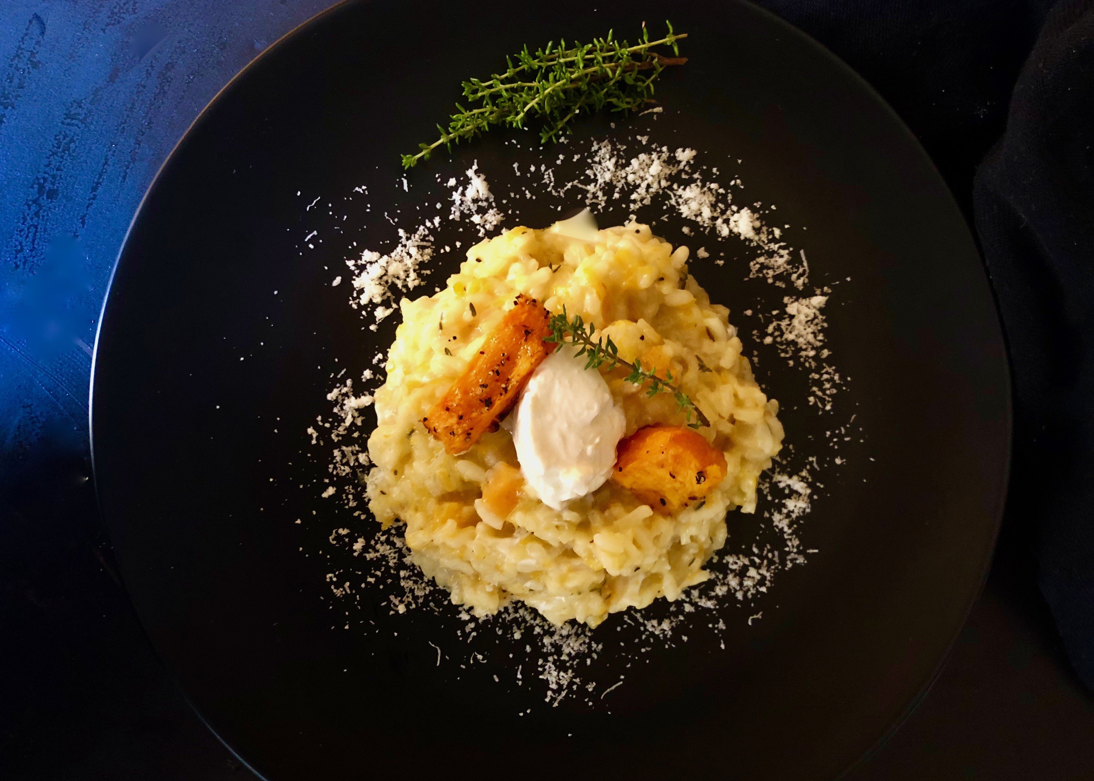 Bergkase Risotto Mit Kurbis Gebratenen Thymian Birnen Und Amarettinibrosel Trickytine Kurbisrisotto Risotto Rezepte
